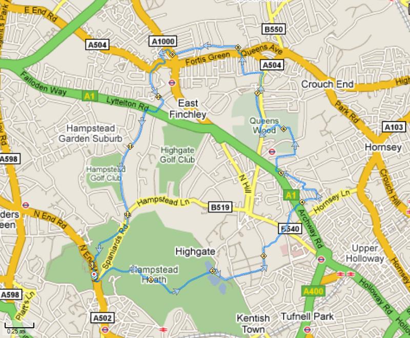 In the end I was kind and barely skirted with Swains Lane before taking us across Waterlow Park, over the Archway Road and through some back-streets to Queens Wood. It's amazing how much green space you can find in North London when you seek it out and with the crocuses emerging the fresh air put paid to my fuzzy head! From here it was all familiar territory leading to my home in Muswell Hill and then through the middle of East Finchley (somewhere visited so infrequently that for a moment even Mike was disorientated and that never happens). Up Winnington Road the group briefly broke up but there were no complaints about the length (around 13km), mud (not so much) or scenery (quite pretty). Maybe I should do this more often!