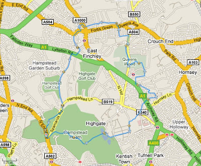 Thankfully it wasn't raining today and so I persevered through a medium-grade hangover to make the meet this morning. A bit of a low turn-out today with just me, Mike, Adam, Rob and Amanda making the effort and as no one had a route in mind the baton passed to me - with the proviso being that we came by my house. So I seized the day and mentally sketched out a plan; one that took advantage of the relaxed nature of Sunday running to try some new paths. Starting with the Heath then we headed over towards Highgate; obviously I was going to take us up a hill but which one? Ah the mind games possible at such a moment!